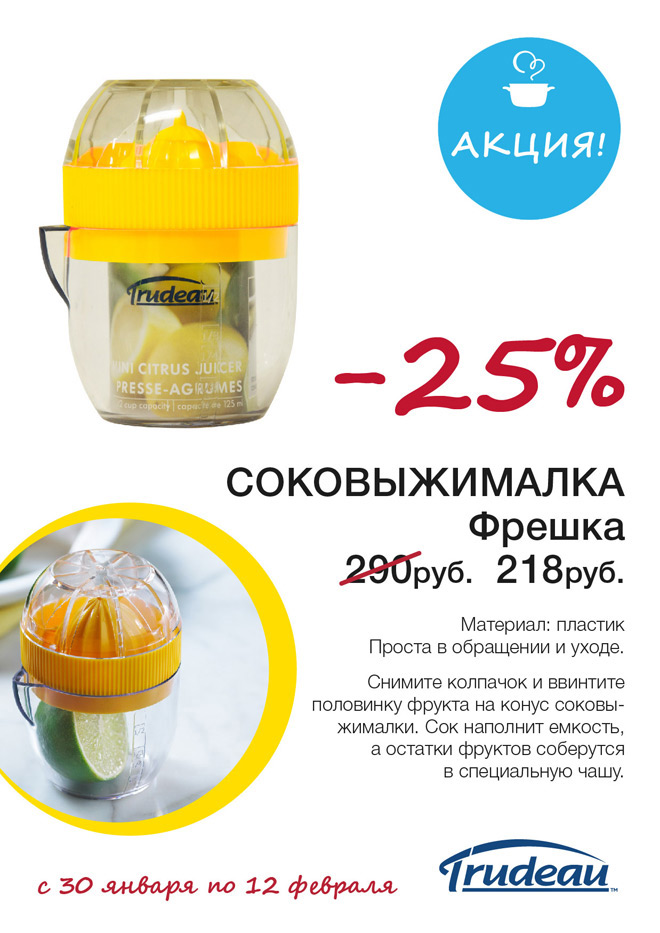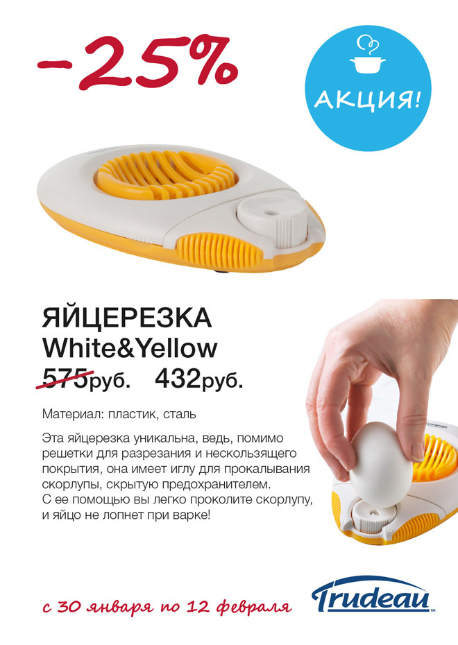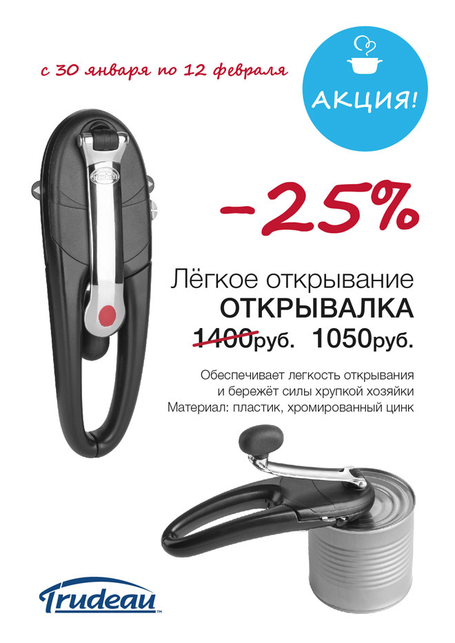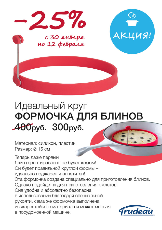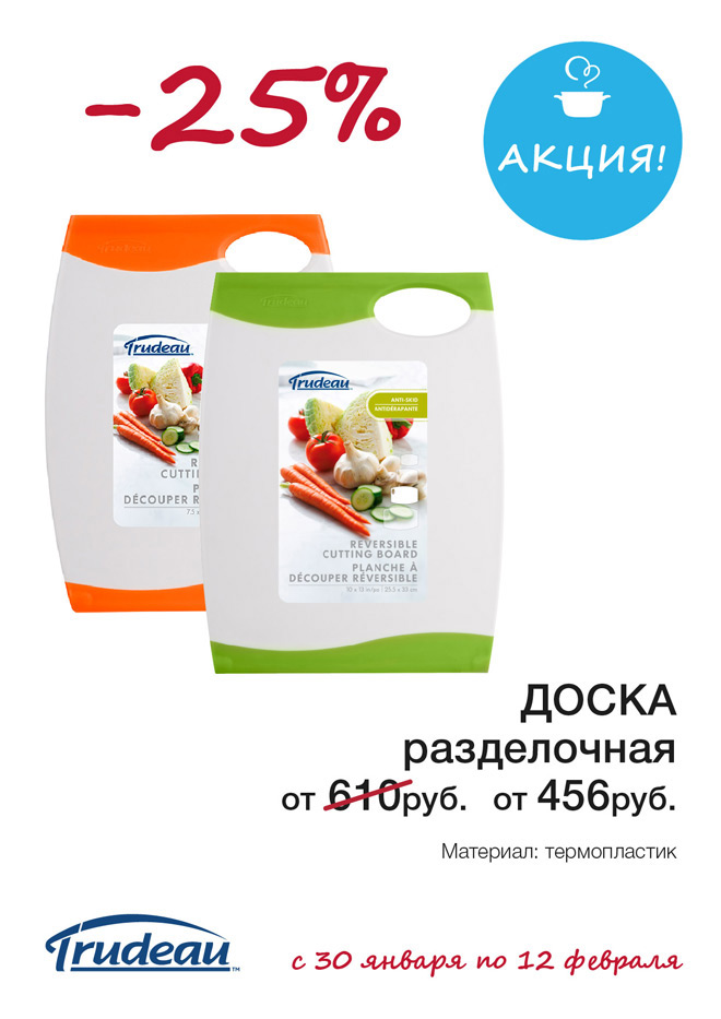 В магазинах CookHouse до 12 февраля 2014 года действует скидка 25% на некоторые кухонные аксессуары: формочку для блинов, яйцерезку, соковыжималку для цитрусовых, открывалку для консервов, разделочные доски.