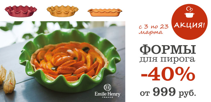 С 3 по 23 марта в магазинах COOK HOUSE действует акция на формы для пирога из керамики французской торговой марки Emile Henry. Покупатели имеют возможность приобрести данную продукцию со скидкой 40%.