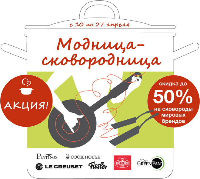До 27 апреля в магазинах COOKHOUSE действует акция. На сковороды с керамическим покрытием, алюминиевые, чугунные, стальные, с индукцией, медные, квадратные, круглые и т.д. популярных марок действуют скидки до 50%.