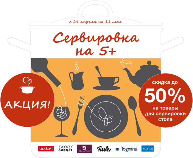 В магазинах COOKHOUSE действует акция «Сервировка на 5+». С 24 апреля по 11 мая на посуду для сервировки действует скидка до 50%.