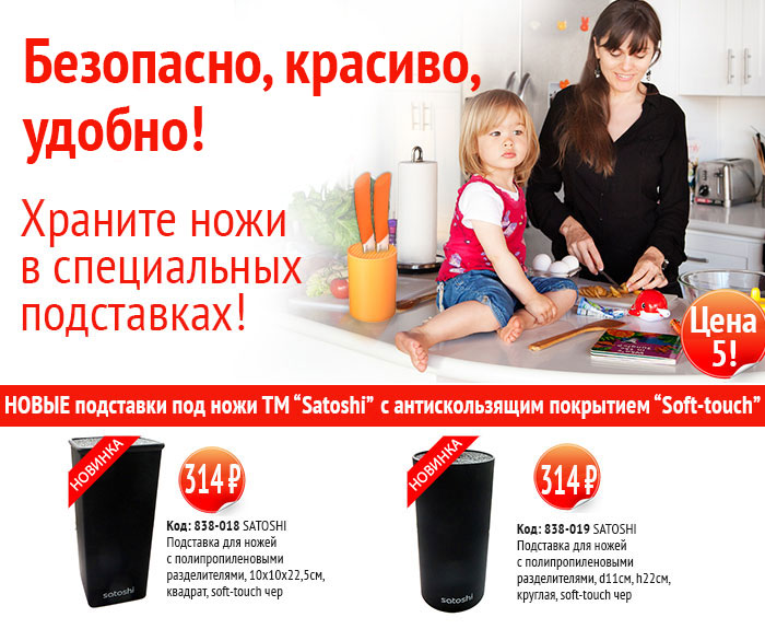 Ассортимент компании "Гала-центр" пополнился новинкой - подставками для ножей собственной торговой марки Satoshi. Изделия имеют полипропиленовые разделители лезвий и антискользящее покрытие Soft-touch.