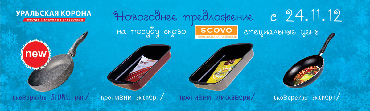В компании "Уральская корона" c 24 ноября 2014 года действует специальное предложение на посуду торговой марки Scovo. В акции участвуют сковороды и противни линии "Эксперт", противни "Дискавери" и сковороды новой линии Stone Pan.