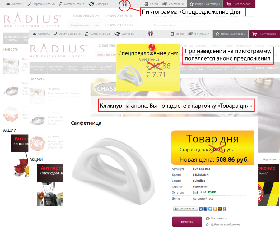 На сайте компании "Радиус" действует акция "Спецпредложение дня" - каждый день на один из товаров действует специальная сниженная цена.