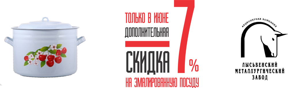 В июне в компании "Уральская корона" покупателям предоставляется дополнительная скидка в размере 7% на отдельные артикулы из ассортимент Лысьвенского завода эмалированной посуды. Акция распространяется на следующие изделия: