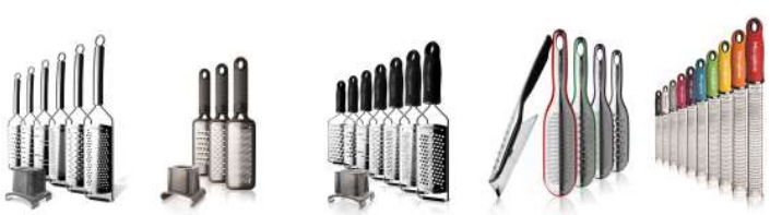 Широкий ассортимент терок и лезвий Microplane разработан с учетом специфики разнообразных продуктов. С помощью различных типов лезвий можно получать разнообразную по форме стружку и измельчать мягкие продукты. В своем ассортименте, помимо универсальной терки четырехгранной формы, Microplane обладает плоскими терками для сыра и шоколада. В коллекции Microplane есть и новаторские терки для цедры в форме «рашпиля» (именно с этой терки началась история бренда). Microplane предлагает не просто терки, но и интересные гаджеты для измельчения продуктов. Например, терка в форме чашки идеально подходит, чтобы натереть корицу или шоколад для напитка.