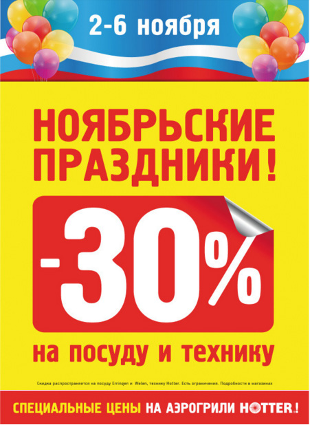 В магазинах "Семь Холмов - Предметы кухни" со 2 по 6 ноября действует акция. На посуду и технику покупателям предоставляется скидка в размере 30%.