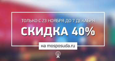 Компания MOSPOSUDA сообщила о запуске новой "скоростной" акции. Только с 23 ноября до 7 декабря покупатели могут приобрести посуду со скидкой до 40% от первоначальной стоимости в случае покупки товара до его поступления на склад. С каждым днем размер скидки будет уменьшаться.