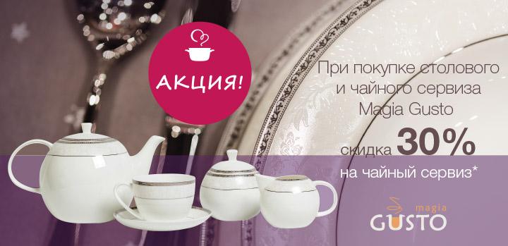 В магазинах COOKHOUSE действует акция. До 15 января 2016 г. при покупке столового сервиза из коллекции «Камелия», «Ностальгия», «Нежность», «Осенний Сад» покупатели получат скидку 30% на чайный сервиз.