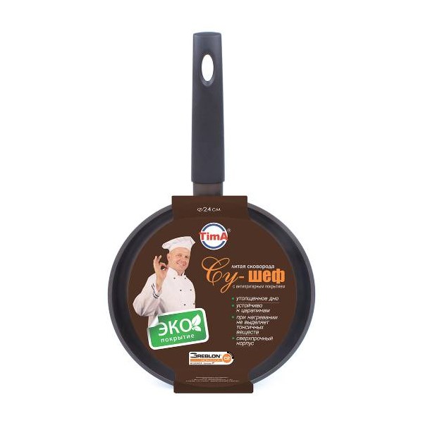 Компания TimA представила новую серия сковород «СУ-ШЕФ» собственной торговой марки. Изделия выполнены из литого алюминия, имеют толщину дна 4мм и стенок - 3,5мм, внутреннее усиленное антипригарное покрытие «GREBLON NON-STICK С2+ Cooper» от немецкой компании Weilburger Coatings GmbH». Цвет сковород - "горький шоколад".