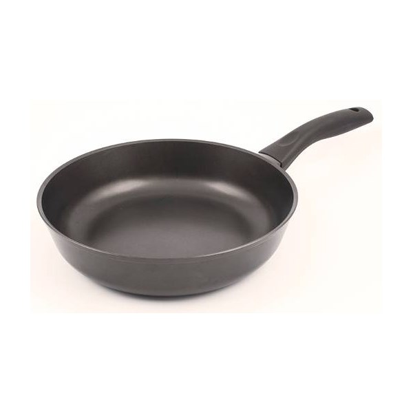 Форма сковороды с закругленным переходом дно-стенки придает изделию современный вид и подходит для жарки и образования хрустящей корочки, а также для тушения продуктов под крышкой.
