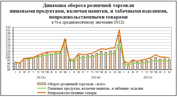 В ноябре 2015г. в структуре оборота розничной торговли удельный вес пищевых продуктов, включая напитки, и табачных изделий составил 48,4%, непродовольственных това-ров - 51,6% (в ноябре 2014г. - 46,8% и 53,2% соответственно).