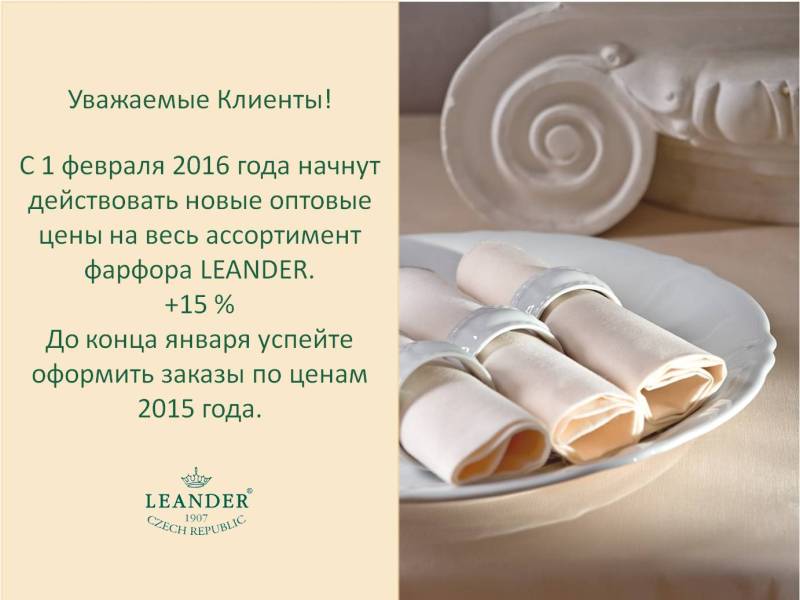 Компания «Арт Маркет Групп» сообщила о повышении оптовых цен на весь ассортимент продукции торговой марки LEANDER на 15%. Новые цены вступят в силу с 1 февраля 2016 года.
