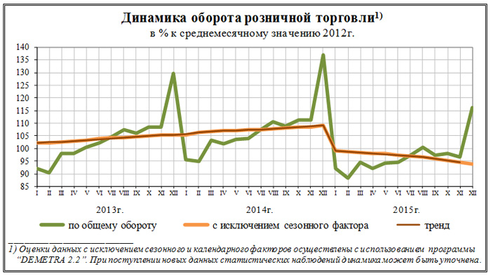 В соответствии с опубликованными Росстатом предварительными данными, оборот розничной торговли в 2015г. составил 27575,7 млрд.рублей, что в сопоставимых ценах составляет 90,0% к 2014г., в декабре 2015г. - 2865,0 млрд.рублей и 84,7% к соответствующему периоду предыдущего года.
