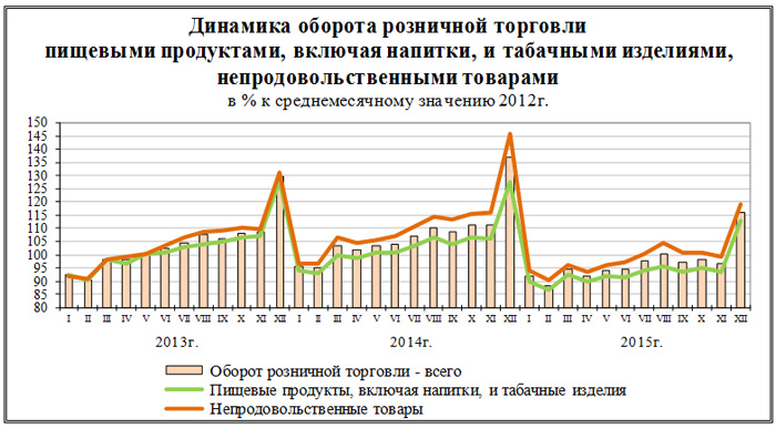 В 2015г. в структуре оборота розничной торговли удельный вес пищевых продуктов, включая напитки, и табачных изделий составил 48,6%, непродовольственных товаров - 51,4% (в 2014г. - 47,0% и 53,0% соответственно), в декабре 2015г. - 48,8% и 51,2% (в декабре 2014г. - 46,1% и 53,9% соответственно).