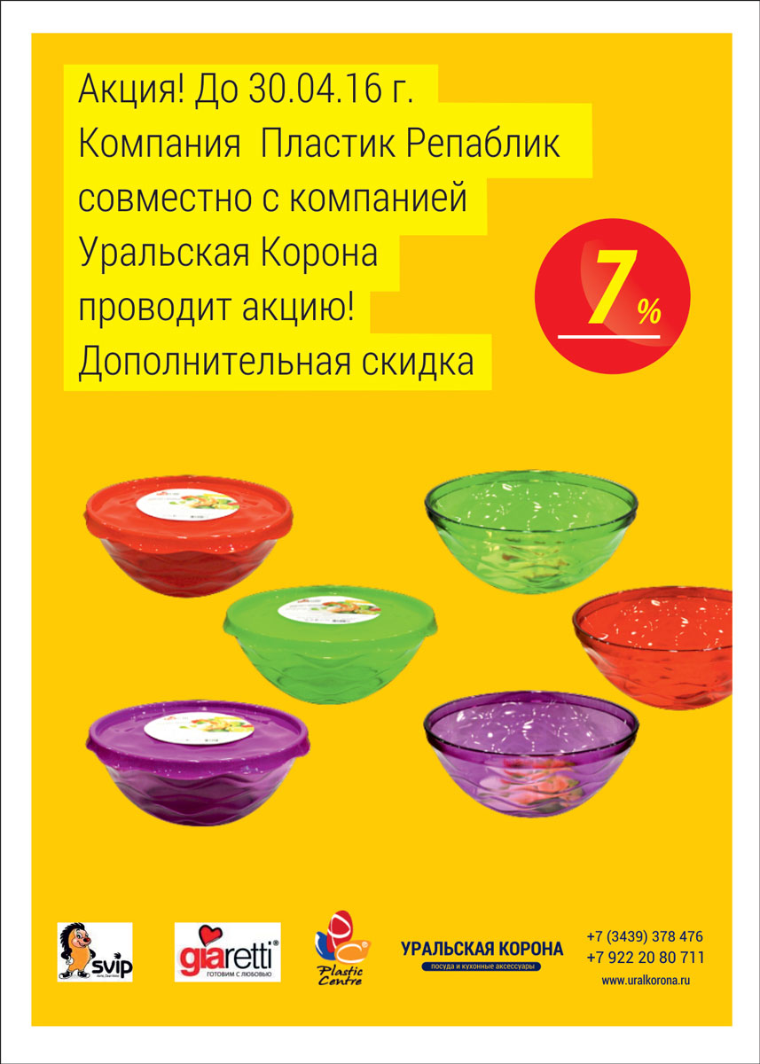 В компании "Уральская корона" проводится акция. На изделия из пластмассы производства московской компании "Пластик Репаблик" действует скидка в размере 7%.