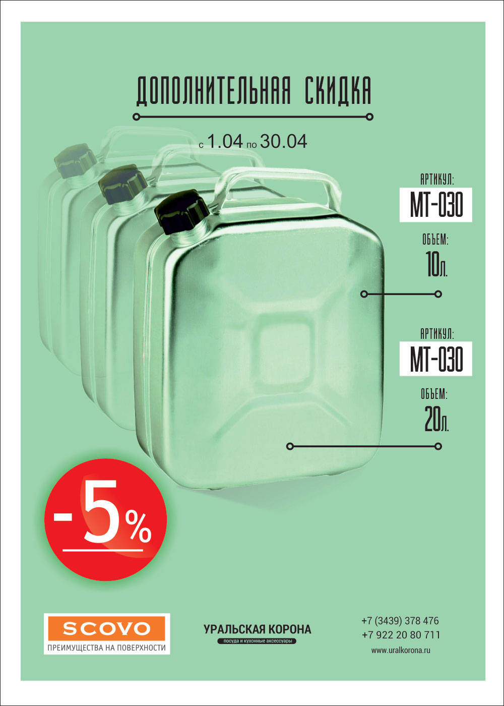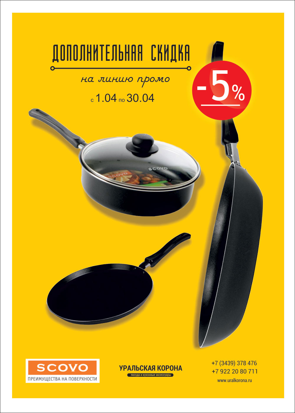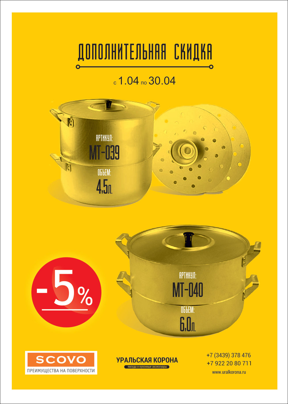 До конца апреля в компании "Уральская корона" действуют специальные условия на продукцию компании SCOVO: линию посуды с антипригарным покрытием "Промо", мантоварки и канистры из матового алюминия. Покупателям предоставляется дополнительная скидка в размере 5%.