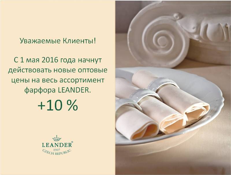 Компания «Арт Маркет Групп» сообщила о предстоящем повышении оптовых цен на весь ассортимент фарфора торговой марки LEANDER на 10%. Новые цены вступят в силу с 1 мая 2016 года.
