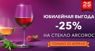 В этом году MOSPOSUDA исполняется 25 лет. В честь юбилея для покупателей действует акция - каждый месяц 25-ого числа различные товары будут предлагаться покупателям со скидкой в размере 25%. В апреле акция проводится на стеклянную посуду ARCOROC.