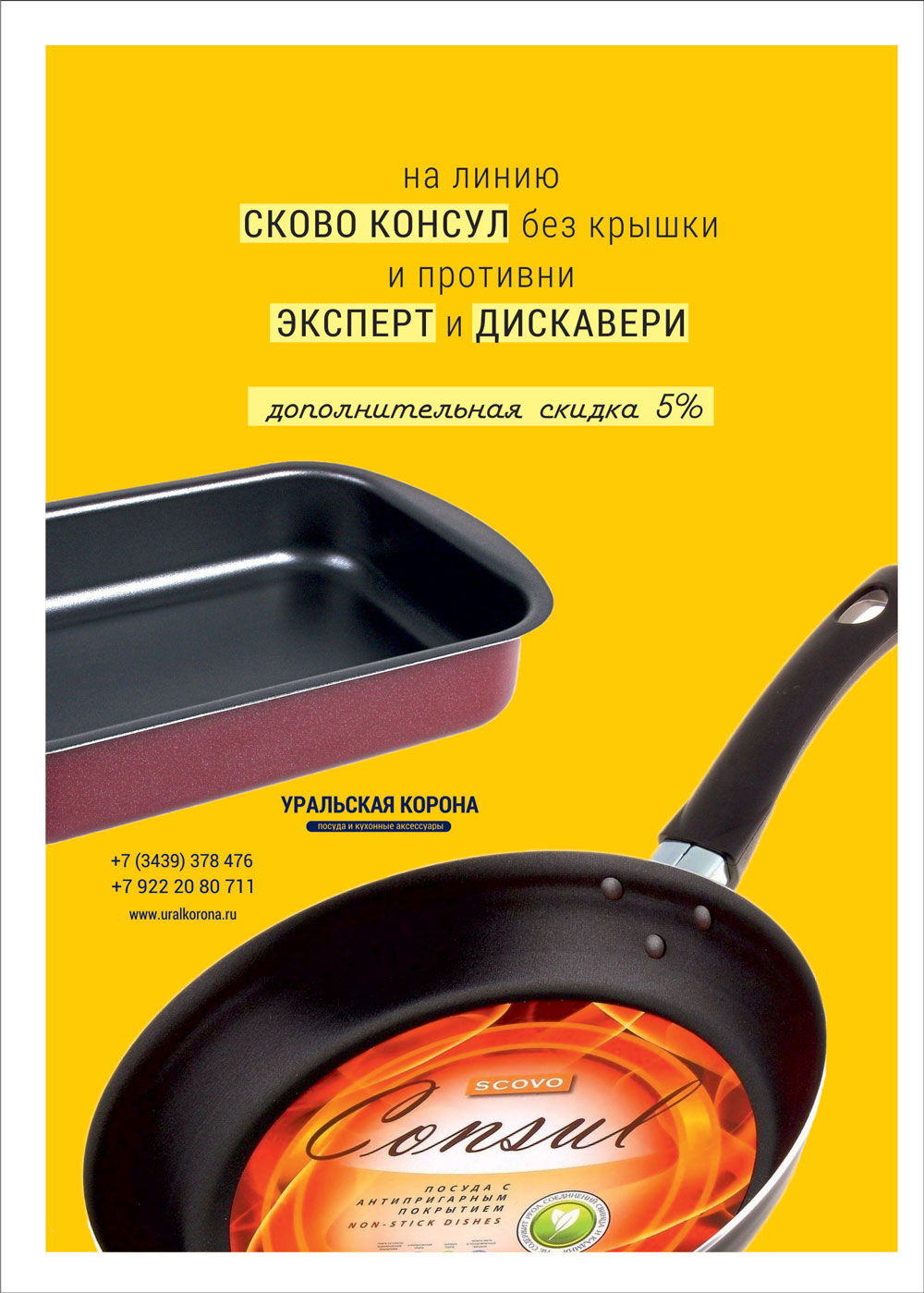 В компании "Уральская корона" проводится акция на линию SCOVO "Консул" без крышки и противни "Эксперт" и "Дискавери". На данную продукцию действует скидка в размере 5%.