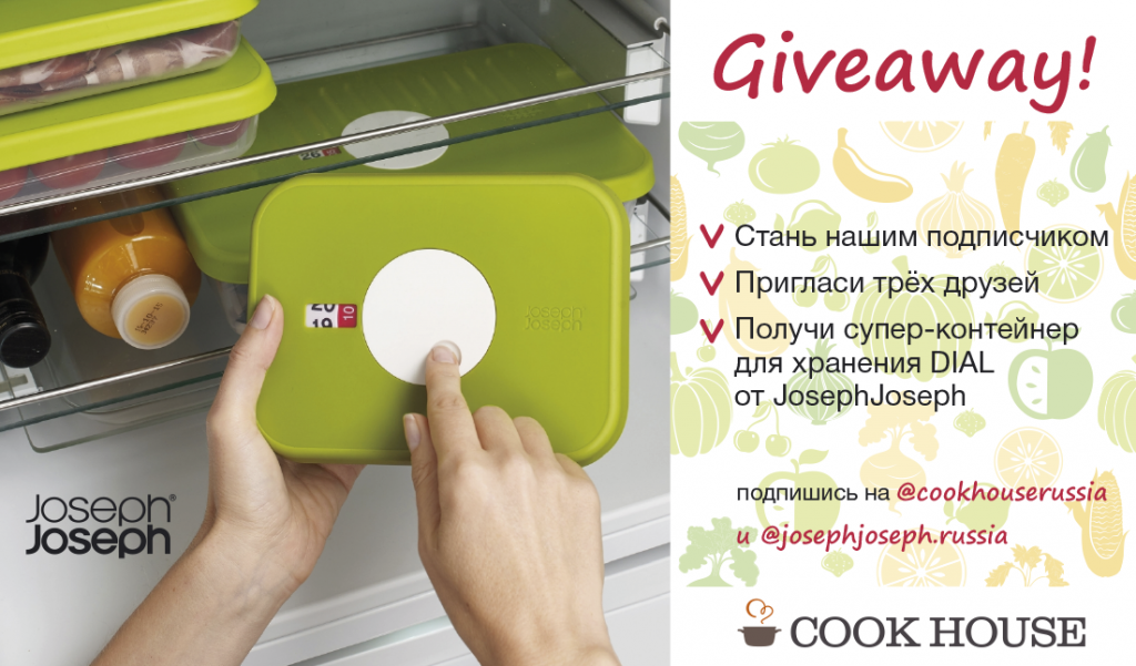 Сеть магазинов Cook House приглашает покупателей принять участие в акции giveaway. Для этого необходимо с 6 июня по 20 июня 2016 г. подписаться на @cookhouserussia и @josephjoseph.russia и разместите комментарий под этим постом с приглашением трех друзей (используя активную ссылку на профили). Три победители акции выиграют контейнеры Dial от Joseph Joseph для хранения продуктов.