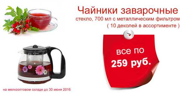 На меклооптовом складе ТД "Конвент" проводится акция. До 30 июня покупателям предлагаются заварочные чайники из стекла с металлическим фильтром объемом 700 мл по цене 259 рублей. В ассортименте представлено изделия с 10 вариантами декоративного оформления.