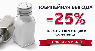 Компания MOSPOSUDA продолжает акции в честь своего 25-летнего юбилея. 25 июля 2016 года для покупателей будет действовать скидка в размере 25% на наборы для специй и салфетницы.