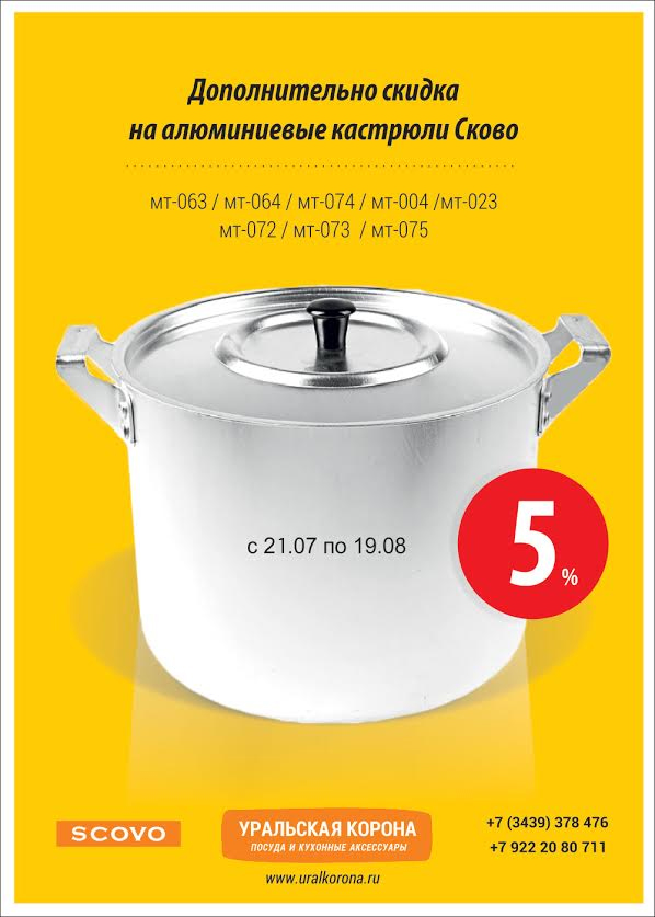 До 19 августа 2016 года в компании "Уральская корона" действует акция на матовые кастрюли из алюминия производства SCOVO. На данную продукцию покупателям предоставляется дополнительная скидка в размере 5%.