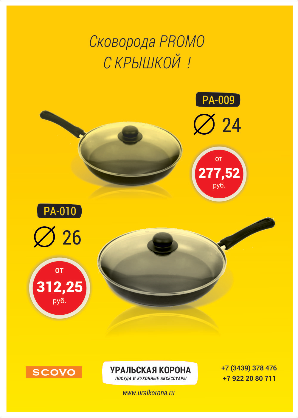В компании "Уральская корона" действует специальное предложение на сковороды с крышкой линии Promo торговой марки SCOVO. Сковорода диаметром 24 см предлагается по цене 277,52 рубля, сковорода диаметром 26 см - по цене 312,25 рублей.