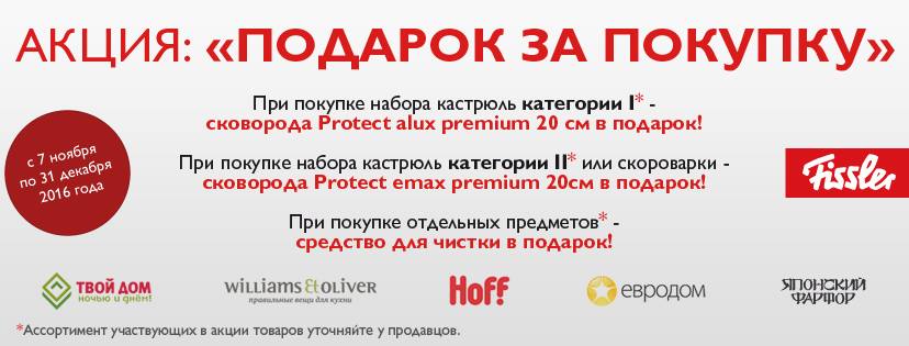 Торговая марка Fissler сообщила о проведении акции "Подарок за покупку". Акция проводится в магазинах "Твой дом", Williams Et Oliver, Hoff, "Евродом", "Японский фарфор". При покупке набора посуды 1-й категории покупатели имеют возможность получить сковороду Protect alux premium d20см, а при покупке набора посуды 2-й категории - сковороду Protect emax premium d20см.