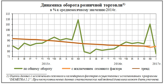 По данным Росстата, оборот розничной торговли в январе 2017г. составил 2204,5 млрд.рублей, что в сопоставимых ценах составляет 97,7% к январю 2016 года.