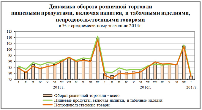 В январе 2017г. в структуре оборота розничной торговли удельный вес пищевых продуктов, напитков и табачных изделий составил 48,8%, непродовольственных товаров - 51,2% (в январе 2016г. - 49,3% и 50,7% соответственно).