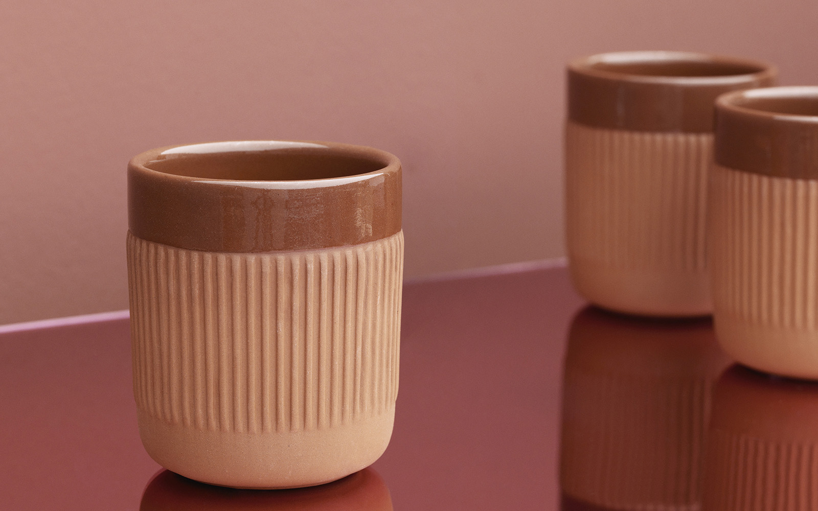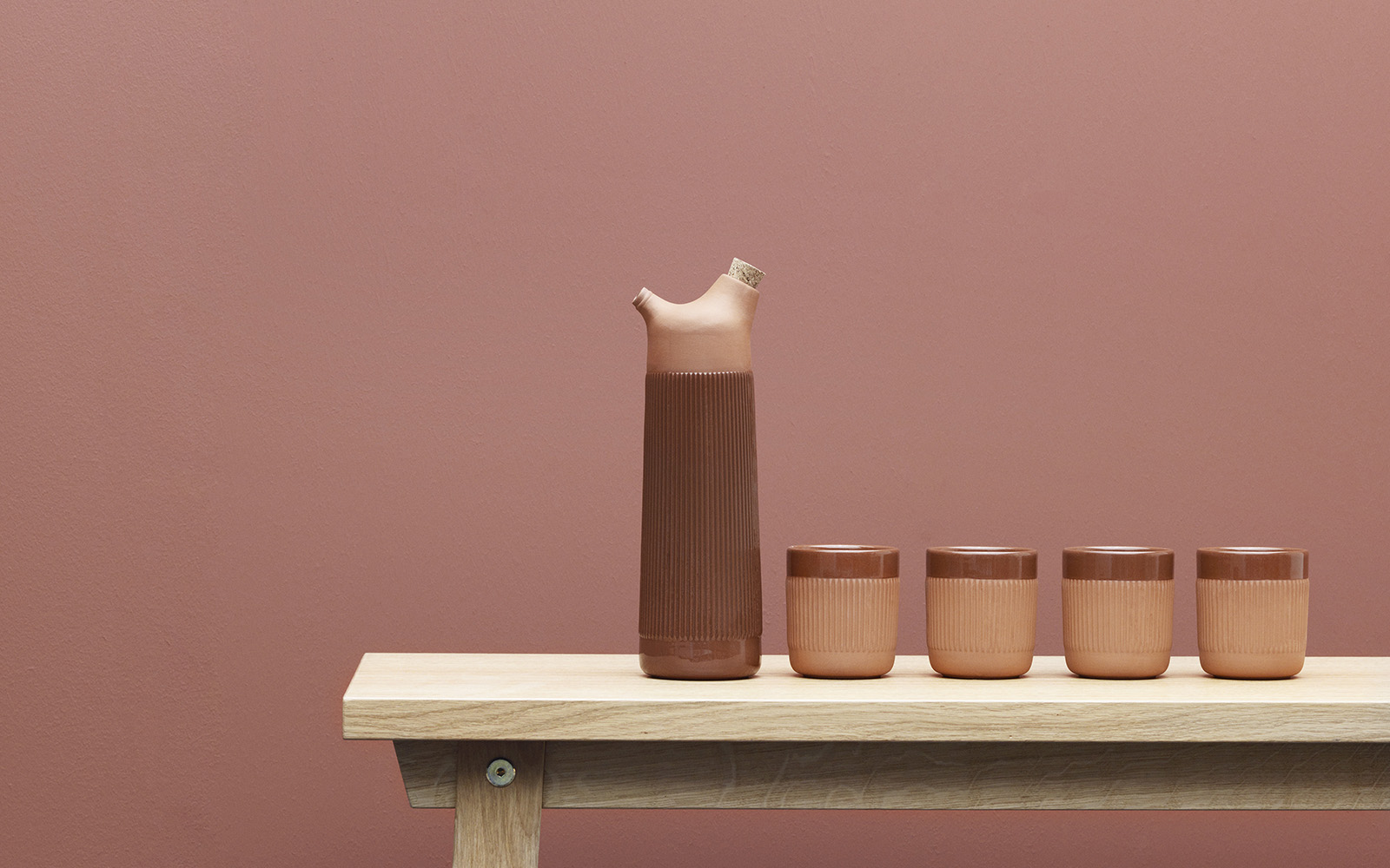 В серию Junto вошел графин и чашки, выполненные вручную из терракоты. В дизайне изделий чередуются различные поверхности: матовые и глазированные, рифленые и гладкие. Графин имеет два носика - один для того, чтобы заливать жидкость, другой - для розлива напитка.