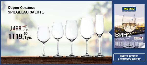 В магазинах "Метро Кэш энд Кэрри" проводится акция. На комплекты их четырех бокалов коллекции SPIEGELAU Salute (для бордо, для шампанского, для белого и красного вина и т.д.) действует специальная цена - 1119 рублей.