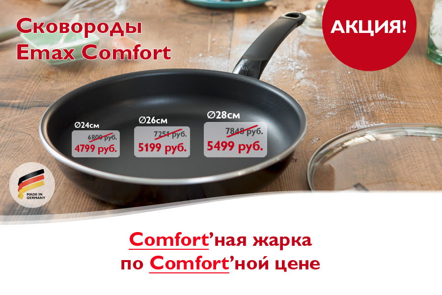 В официальном интернет-магазине Fissler проводится акция. В период с 20 ноября по 02 декабря покупателям предлагаются сковороды Emax Comfort по Сomfort'ной цене со скидкой до 30%.