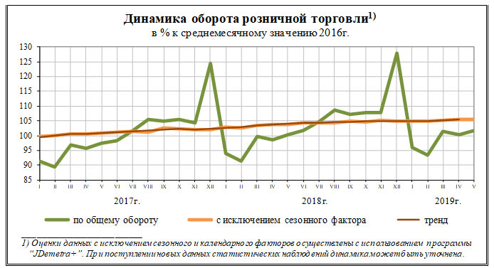 По данным Росстата, оборот розничной торговли в мае 2019 г. составил 2688,9 млрд рублей, или 101,4% (в сопоставимых ценах) к уровню соответствующего периода предыдущего года, в январе-мае 2019 г. - 12956,5 млрд рублей, или 101,7%.