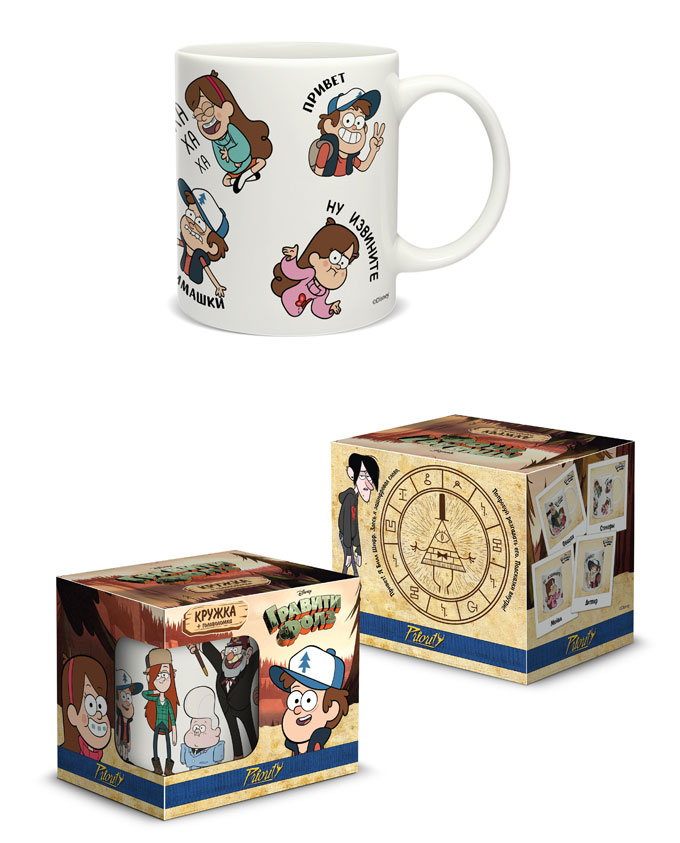 Мультсериал «Гравити Фолз» популярен среди взрослой аудитории, поэтому дизайнеры марки выбрали кружки объемом 350 мл. из костяного фарфора New Bone China. Кружки упакованы в подарочную картонную коробку, на обратной стороне которой размещена загадка. Для того, чтобы разгадать ее, нужно воспользоваться подсказкой, спрятанной внутри коробки. В коллекцию вошли четыре кружки: «Вся банда», «Мейбл», «Диппер», «Стикеры». Посуду можно мыть в посудомоечной машине и использовать в микроволновой печи.