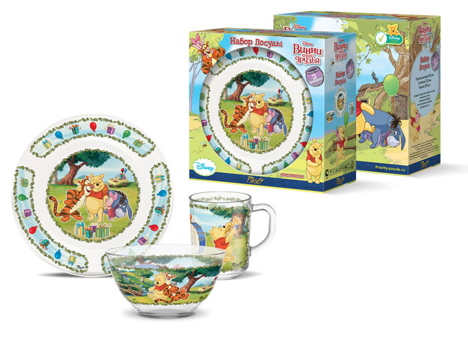В коллекцию «Винни и его друзья» входят кружка 200 мл., салатник 500 мл. и тарелка 20 см., выполненные по заказу бренда на Опытном Стекольном Заводе (г. Гусь-Хрустальный). Для декорирования были выбраны изображения из классического анимационного сериала Disney. Посуда упакована в подарочную картонную коробку, которую дизайнеры PrioritY традиционно дополнили развлекательными элементами: ребусом и раскраской.