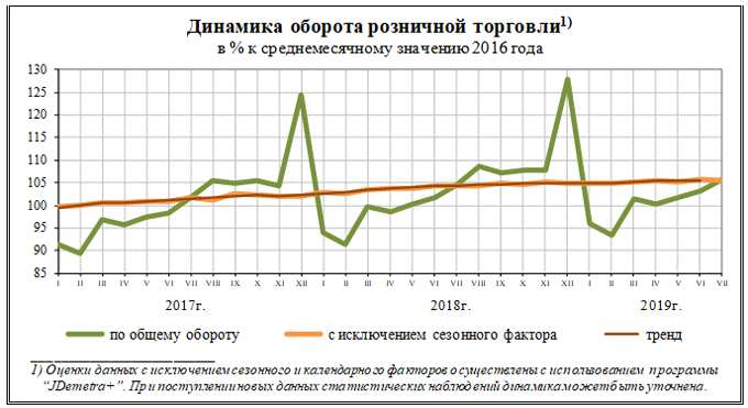 По данным Росстата, оборот розничной торговли в июле 2019 г. составил 2792,9 млрд рублей, или 101,0% (в сопоставимых ценах) к уровню соответствующего периода предыдущего года. Это самый низкий показатель роста с начала текущего года. В январе-июле 2019 г. оборот розничной торговли составил 18480,5 млрд рублей, или 101,6%.