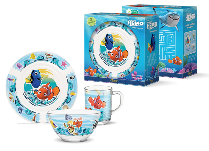Герои одного из самых успешных проектов студии Pixar «В поисках Немо» изображены на кружке 200 мл, салатнике 500 мл. и тарелке диаметром 20 см. Для декорирования использована двойная деколь, поэтому посуда выглядит особенно ярко. Набор упакован в подарочную картонную коробку, внутри которой прячется раскраска.