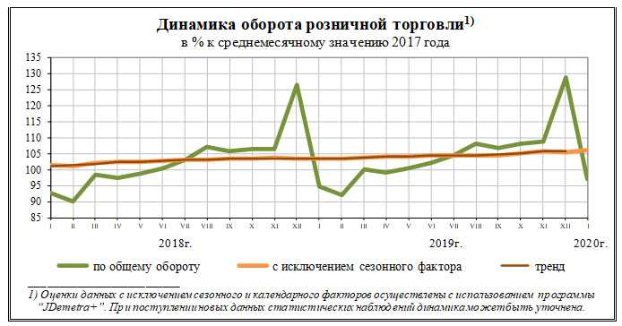 По данным Росстата, оборот розничной торговли в январе 2020 г. составил 2632,7 млрд рублей, или 102,7% (в сопоставимых ценах) к январю предыдущего года.