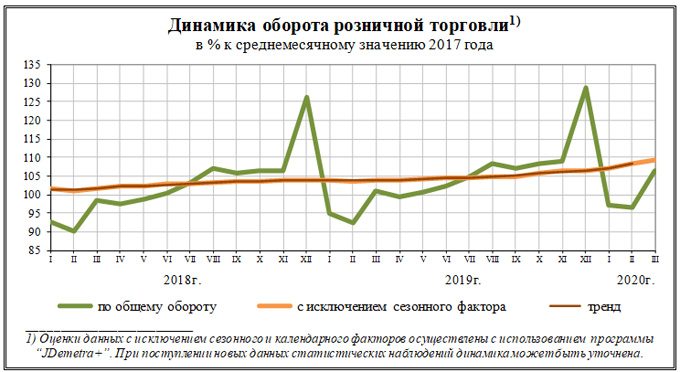 По данным Росстата, оборот розничной торговли в марте 2020 г. составил 2914,9 млрд рублей, или 105,6% (в сопоставимых ценах) к уровню соответствующего периода предыдущего года, в I квартале 2020 г. - 8178,7 млрд рублей, или 104,3%.