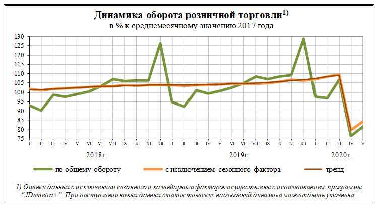 По данным Росстата, оборот розничной торговли в мае 2020 г. составил 2257,3 млрд рублей, или 80,8% (в сопоставимых ценах) к уровню соответствующего периода предыдущего года, в январе-мае 2020 г. - 12553,5 млрд рублей, или 93,9%.