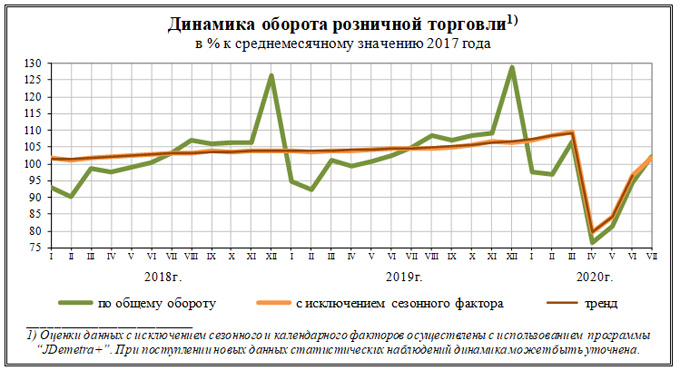 По данным Росстата, оборот розничной торговли в июле 2020 г. составил 2843,2 млрд рублей, или 97,4% (в сопоставимых ценах) к уровню соответствующего периода предыдущего года, в январе-июле 2020 г. - 18020,2 млрд рублей, или 94,2%.