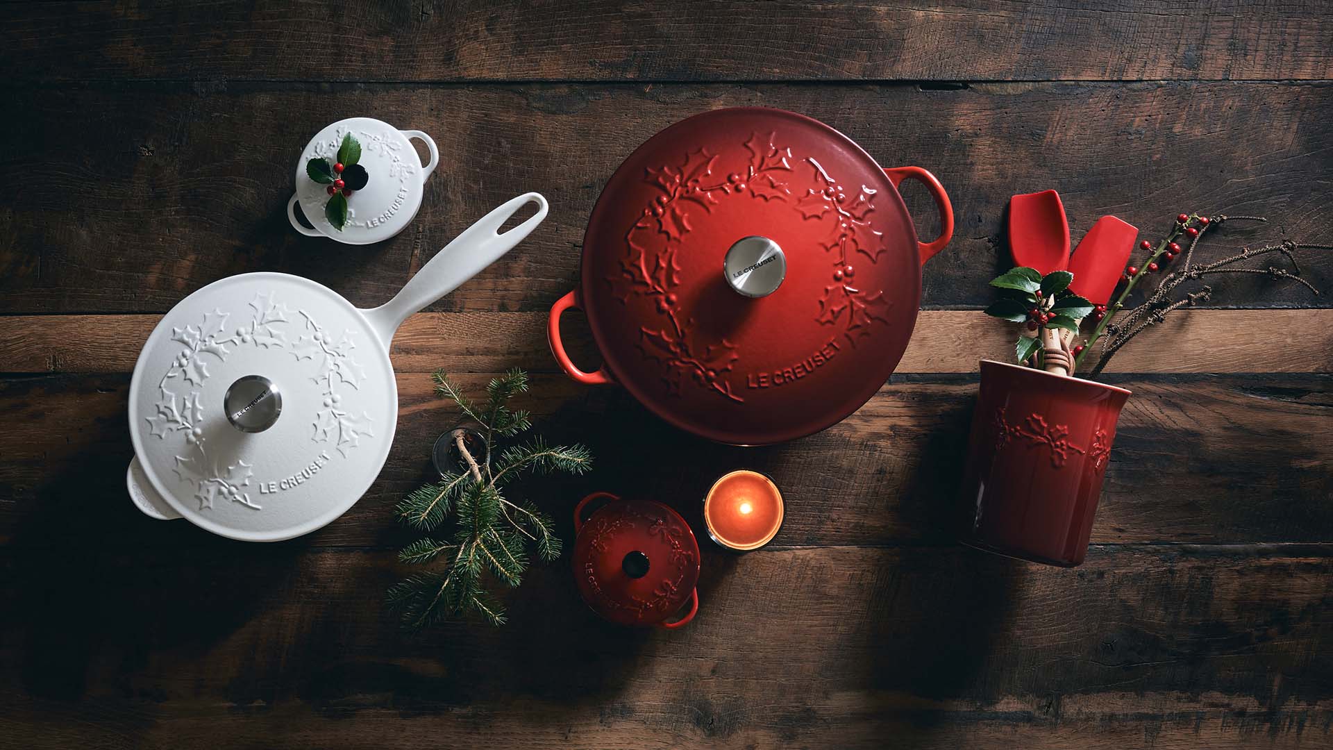 Французский бренд Le Creuset к надвигающемуся рождеству подготовил для своих покупателей лимитированную коллекцию. В нее вошли кастрюли, сотейники и сковороды из чугуна, формы для запеканок, миски, кружки, кувшины и т.д. Все предметы коллекции выполнены в красном (Cerise) и белом (Cotton) цветах.