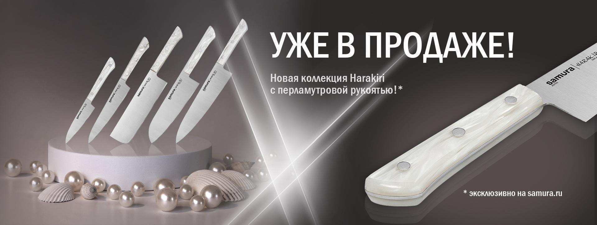 Торговая марка Samura представила новую коллекцию кухонных ножей HARAKIRI с перламутровыми рукоятками. Лезвия ножей изготавливаются из стали AUS-8, рукоятки - из акрила. В ассортименте представлены различные типы ножей.
