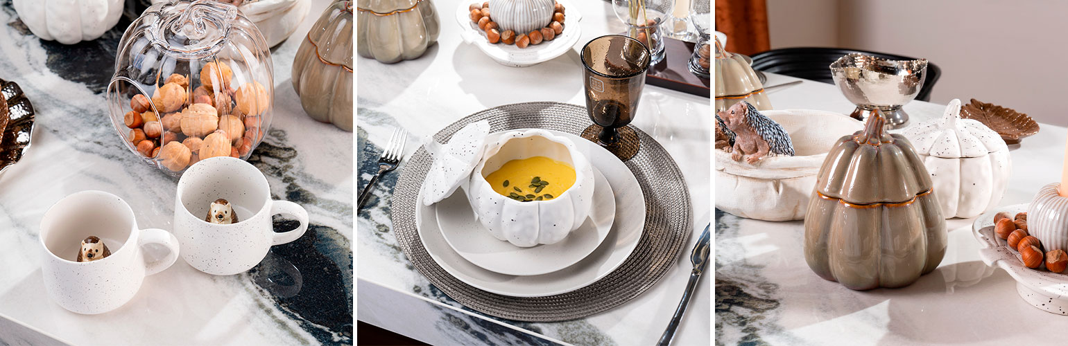Кружки, салатники, емкости для хранения, сервировочные изделия и другие предметы из керамики пополнили ассортимент линии FOGGY MORNING торговой марки Kuchenland. Дизайн предметов выполнен с использованием образов животных и растений: ежиков, енота, кота, тыкв, цветов и т.д.