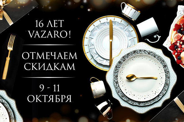 С 9 по 11 октября 2023 года включительно в магазинах Vazaro действуют дополнительные скидки в честь дня рождения. В акции представлены почти все категории товаров: посуда для сервировки, столовые приборы, кухонные аксессуары и полезные гаджеты, посуда для приготовления из любых материалов, бытовая техника и все для бара.