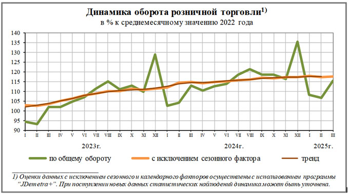 По данным Росстата, оборот розничной торговли в марте 2025 г. составил 4 941,2 млрд рублей, или 102,2% (в сопоставимых ценах) к соответствующему периоду предыдущего года, в I квартале 2025 г. - 14 046,4 млрд рублей, или 103,2%.