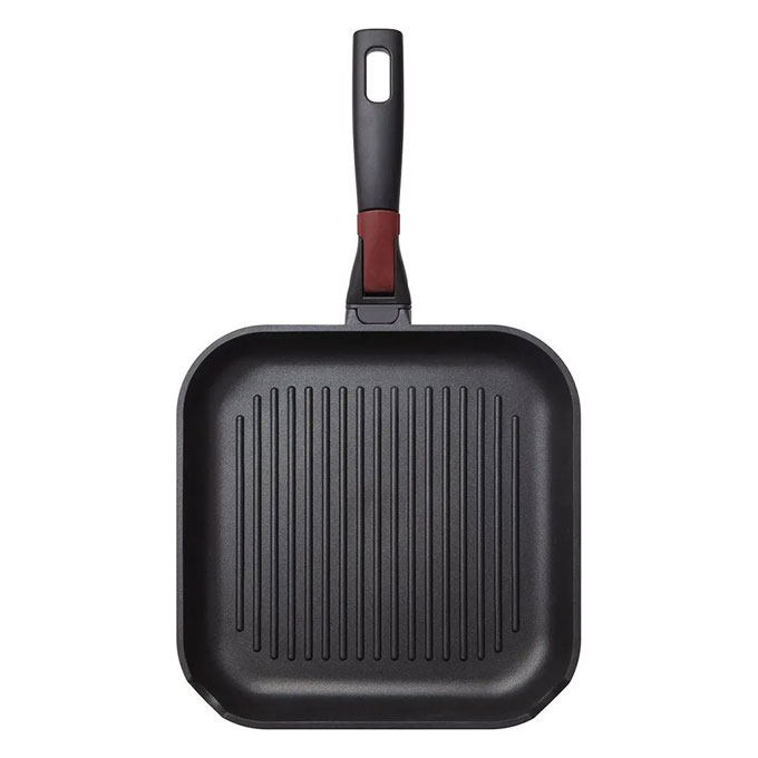 Проверенная годами сковорода-гриль Saporelax от итальянской компании Risoli выполнена из литого алюминия и имеет дно толщиной 6 мм. Складная силиконовая ручка экономит место при хранении и дает возможность использовать сковороду в духовом шкафу (до 250 °C). Антипригарное покрытие начального уровня Teflon Classic является одним из лучших своем классе, но требует аккуратного обращения.