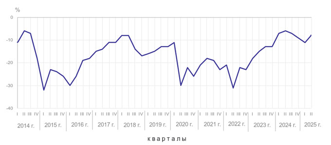 Индекс ожидаемых изменений экономической ситуации в России на краткосрочную перспективу во II квартале 2025 г. по сравнению с I кварталом 2025 г. возрос на 4 п.п. и достиг (0%).